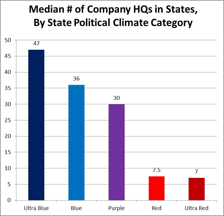 (1) By a margin of about 7:1, companies favor having their HQ in Ultra-blue v. Ultra-red states. Median # of company HQs per state variety (states by category are listed at the bottom of this post): Ultra-blue 47, Blue 36, Purple 30, Red 7.5, Ultra-red 7.